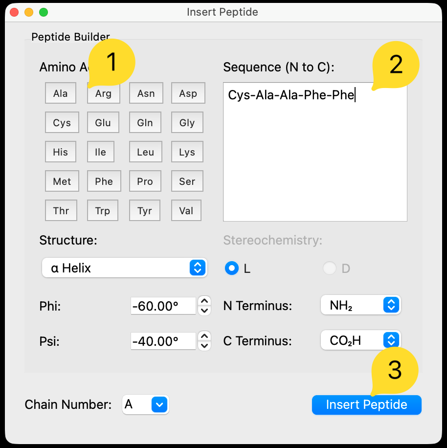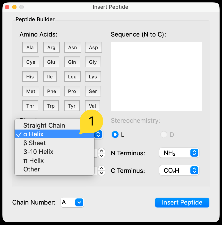 Click to insert the sequence into the main window. The new oligopeptide will be selected automatically, and the manipulate tool will allow you to translate and rotate the chain into the position you want.