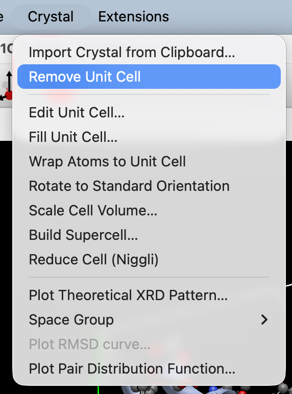 If the unit cell is unwanted, you can remove the unit cell under the “Crystal” menu by selecting “Remove Unit Cell”.