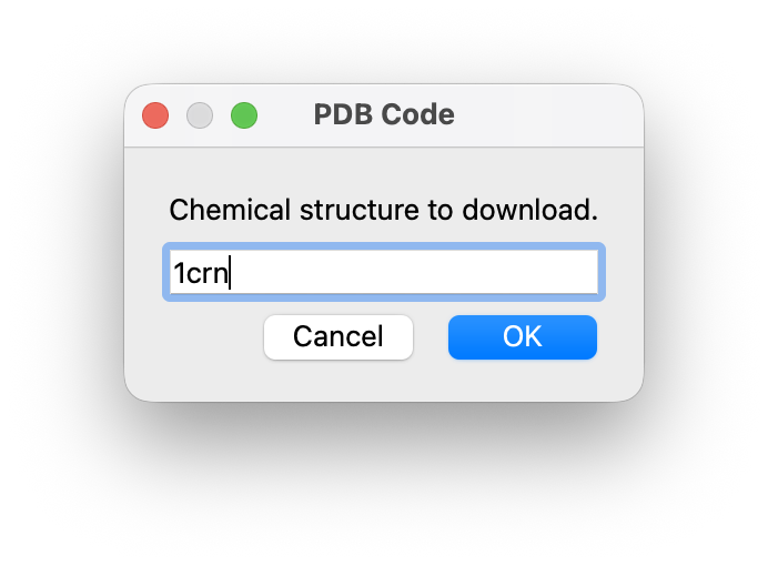 A dialog will come up and allow you to enter a PDB code (e.g., 1CRN for crambin or 6vxx for the COVID spike protein)