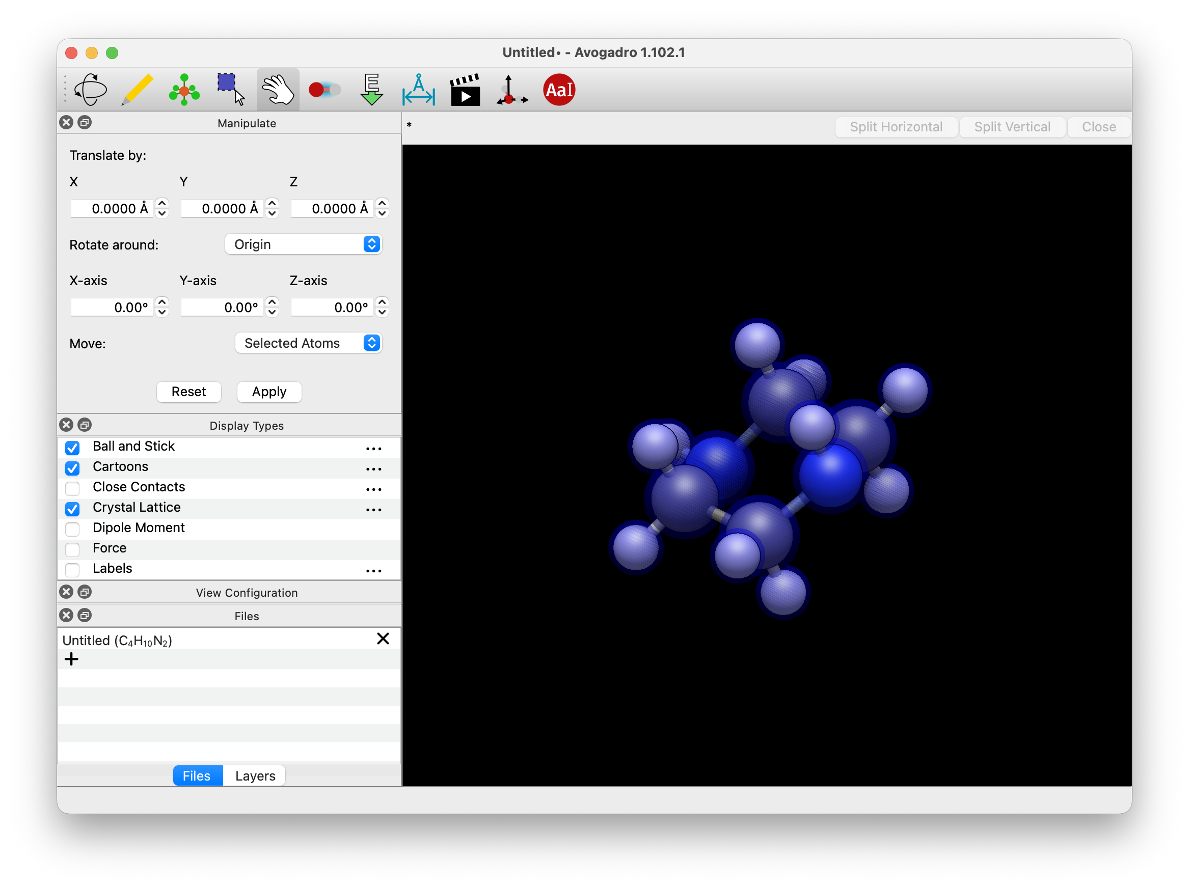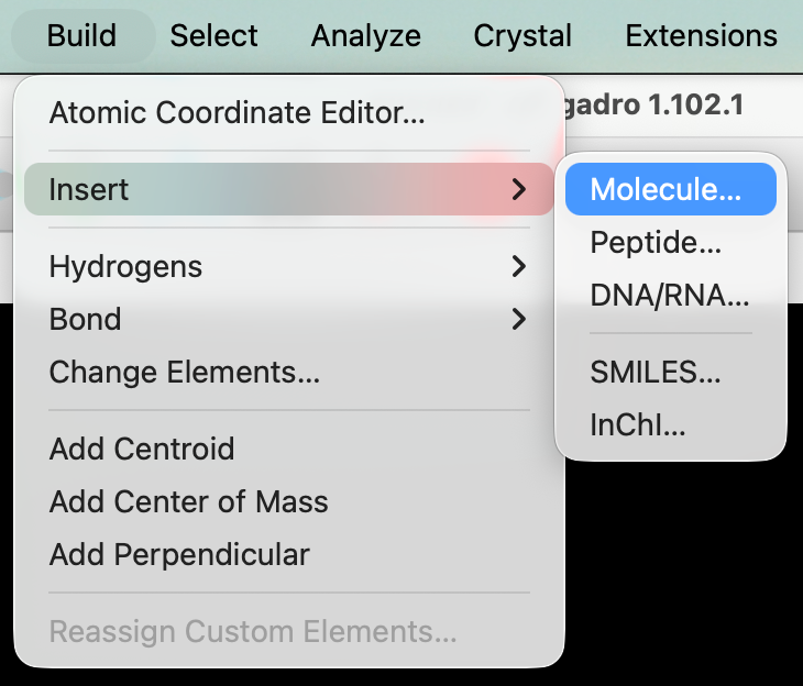 Avogadro includes over 400 common molecules and molecular fragments to make building larger structures easy. These molecules are always available even if you don’t have a network connection or cannot import by name.