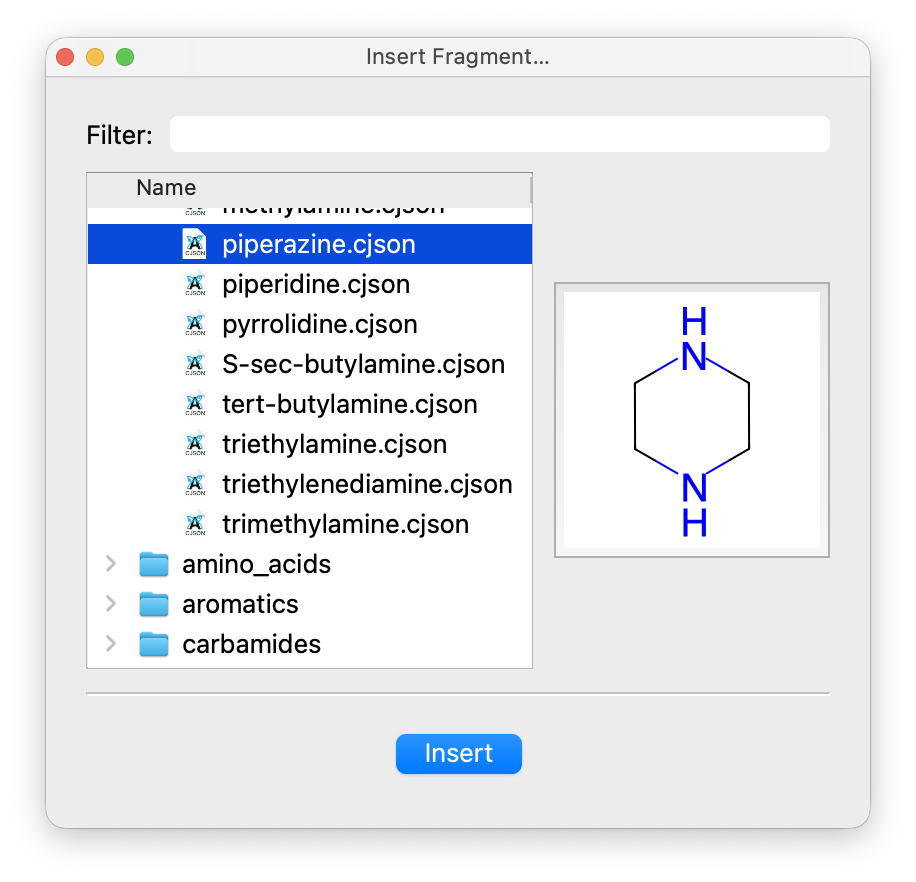 A database of fragments will then pop up (shown below). You can filter the selection if need be. When you click on a particular fragment, a preview will appear: