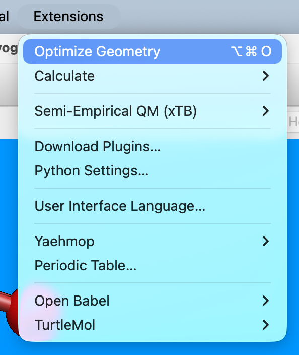 The molecule you have drawn will probably not look very tidy or realistic. Once you’ve created your molecule, you can quickly optimize its geometry using an Extension. Selecting the Extensions menu, and clicking Optimize Geometry will provide your molecule with proper bond lengths and angles.