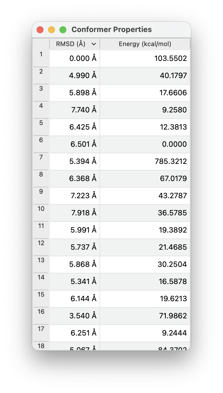 The RSMD column will indicate the root mean squared displacement of atomic coordinates (in Å) compared to the first geometry. The Energy column will indicate the relative energy compared to the lowest-energy conformer.