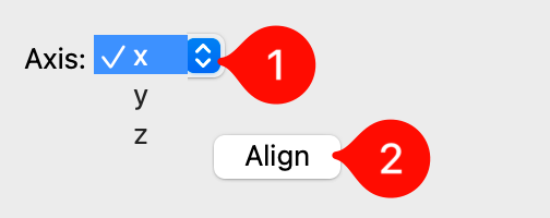First, an alignment axis is chosen from the Axis drop-down menu in the Align pane. The x, y, and z keys on the keyboard are shortcuts for changing the alignment axis.