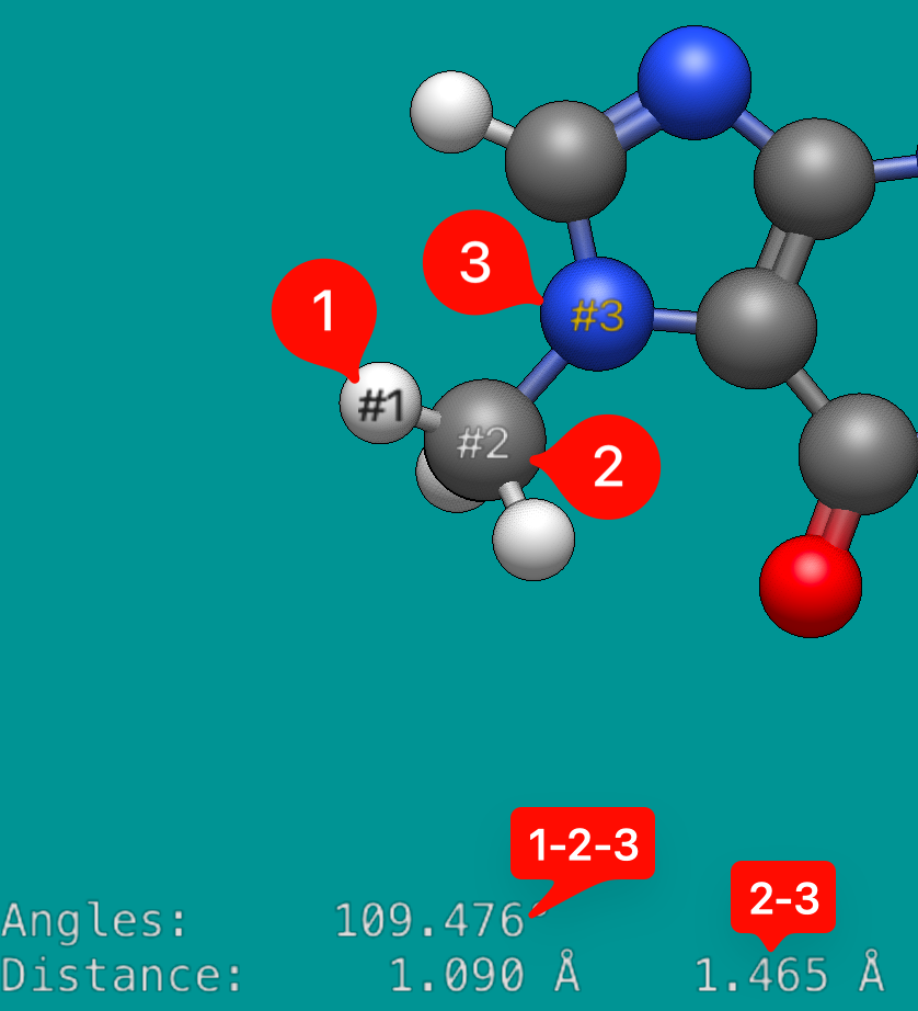 If four atoms are selected, a dihedral angle is determined (e.g. 149.981° for atoms 1-2-3-4), as well as the 2-3-4 angle, and the 3-4 distance.