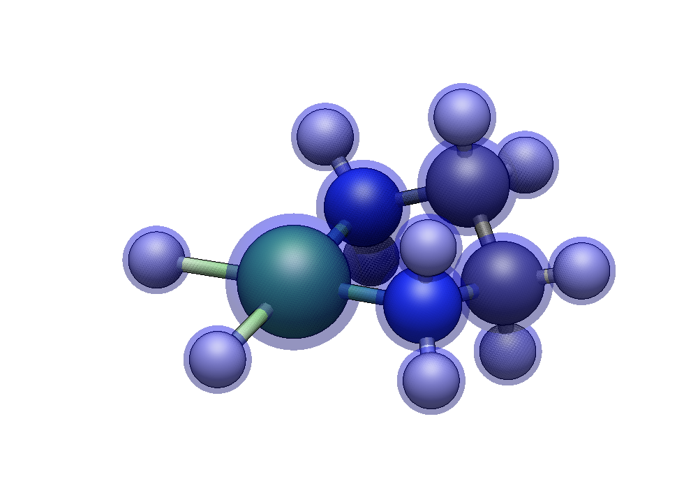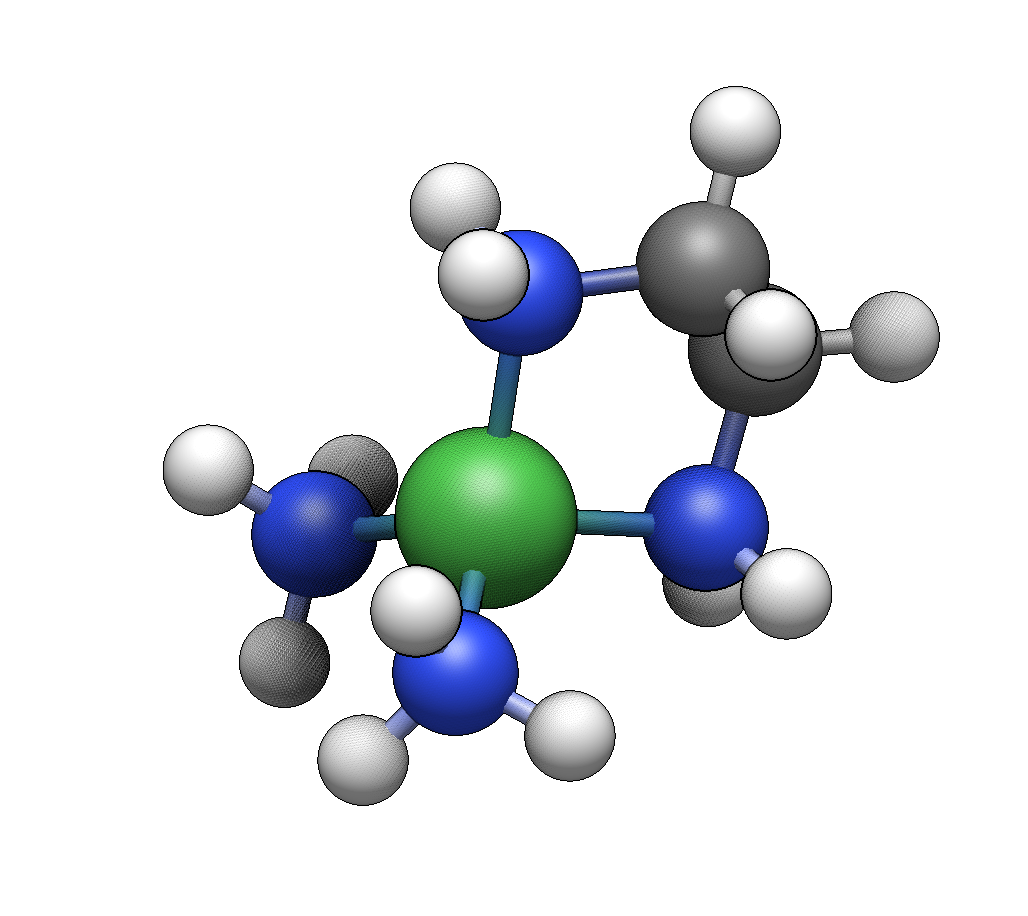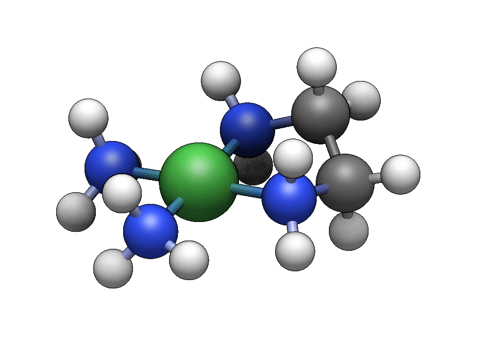 Now we’ll build [Ni(en)(NH₃)₂]²⁺, which combines a bidentate ethylenediamine with two monodentate ammine ligands. We’ll also explore how the same ligand set can adopt different geometries.