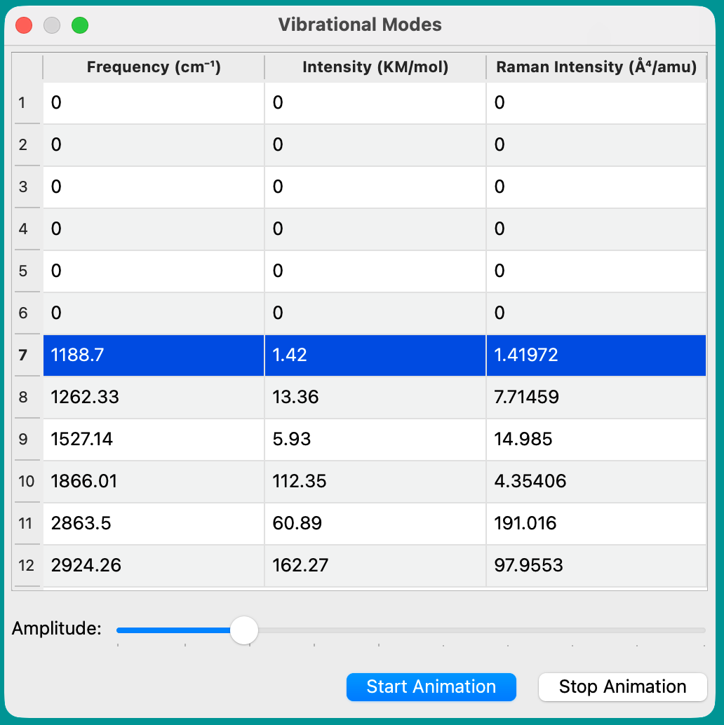 This toolbar allows you to view the various vibrations of a molecule. Selecting a frequency, and clicking “Start Animation” will begin a vibration.